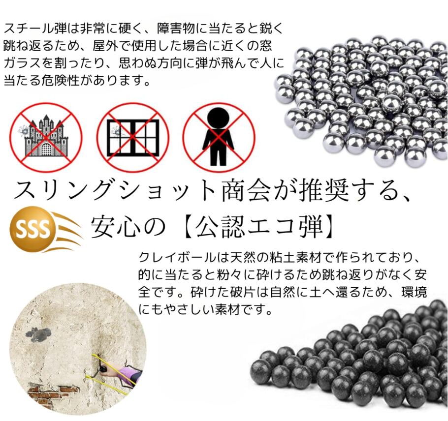 ④ スリングショット商会が推奨する公式エコ弾 スリングショット商会が推奨する、安全性と環境性能を兼ね備えた信頼の一品。屋外トレーニング、害獣威嚇、遊びなど幅広く活用できます。
