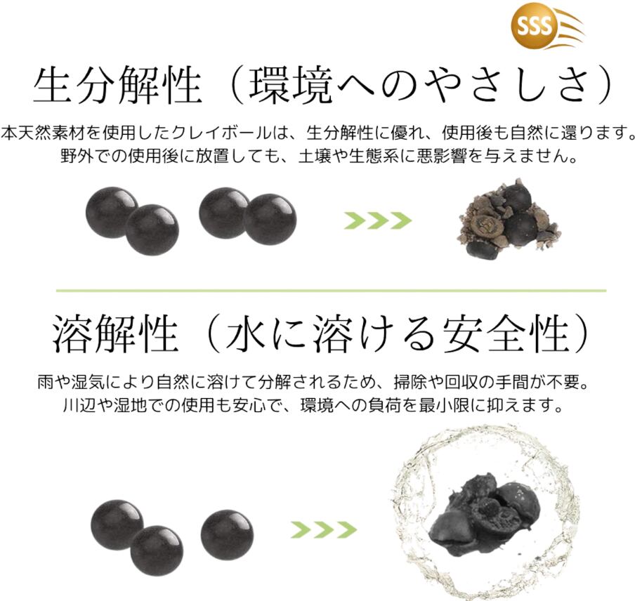 ① 環境にやさしい生分解性素材 天然の粘土素材を使用したエコ弾は、生分解性に優れ、使用後は自然に還元されます。森林や河原での使用でも、土壌や水質に悪影響を与えません。